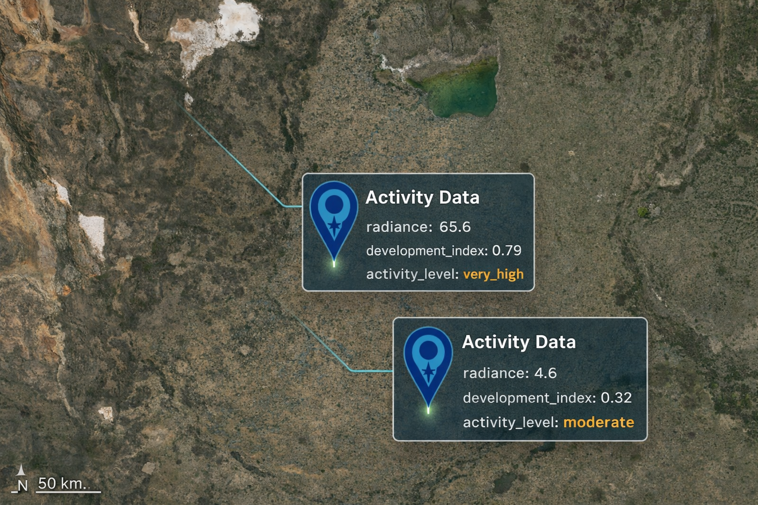 Activity data complements population data by capturing a different dimension of location intelligence. Two places with similar population levels may have very different levels of infrastructure, commerce, and economic activity.